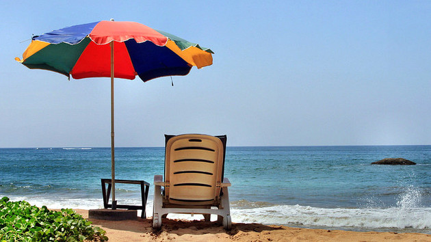 zusammen mit der Liege, dem Schirm und dem weiten Meer.